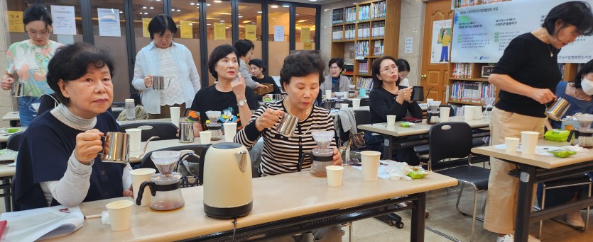 -슬기로운 노년생활-1차 취미로 만나는 커피와 차 강의가 참석자분들과 함께 했습니다커피도 내리고 시음하면서 늘 마시는 커피에 관해 강의를 들었었습니다. 모두 행복해 하시면서 커피와 함께하는 시간을 즐기면서 다음강좌를 기대하셨습니다2차는 취미로 만나는 커피와 차중 '차'입니다