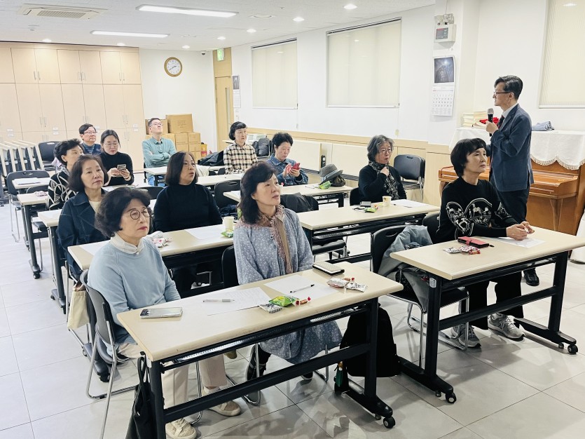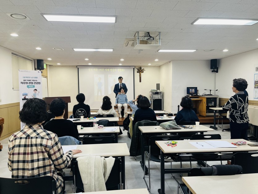 -날자:11월8일 토요일 오후2시-장소:지하1층 성가정방 사피엔스 작은도서관 4차 강의가 박성진 재활의학과원장님을 모시고 시니어분들의 관절건강과 올바른 자세교정에 대해 실습과 자세한 설명을 해주셨습니다무심코 하는 습관적인 자세가 시니어분들의 삶을 더욱더힘들게하니 간단한 자세교정으로도 더나은 건강을 유지할수 있으니 다같이 실천해 나가도록 합시다